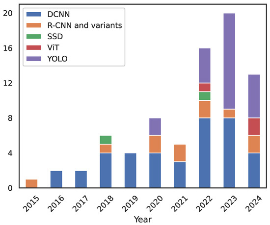 Transformer-based architectures have recently emerged as more accurate alternatives to DCNN architectures for image classification and object detection. A transformer is a deep learning architecture that uses attention mechanisms with an encoder–decoder structure to model sequences and make global connections between inputs and outputs [45]. Benefits of vision transformers for image classification and object detection include their global perception of images and their lack of reliance on human-engineered features such as anchor boxes [46]. Image-based transformers take as input either a CNN-derived feature map [46] or patches of the images themselves [47]. Examples of transformer-based models for computer vision tasks include ViT [47], a model for image classification, and DETR [46], a model for object detection.