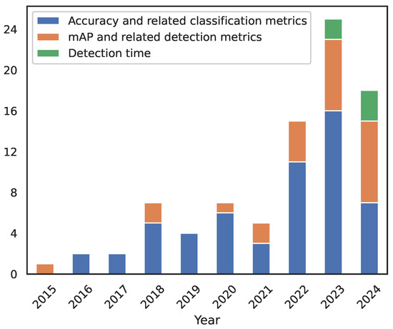 To visualize trends related to employed machine learning architecture and evaluation metrics, the contents of Table 1 and Table 2 are presented as stacked bar graphs. Figure 2 shows the distribution of machine learning architecture by year and the general trend has been an increase in applications of deep learning to fish classification and detection. There has also been a recent increase in the use of YOLO architectures, starting from 2022. For each year from 2018 to 2024, there were four or more uses of DCNNs. Figure 3 shows the distribution of employed evaluation metrics by year and indicates that even through 2023, accuracy or related classification metrics such as precision or recall were the preferred evaluation metrics. Only recently have other metrics such as detection time been reported in the literature.