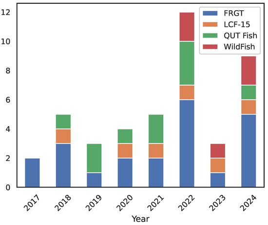 In an effort to characterize the utilization of the datasets, the four most commonly reported datasets from Table 4 were considered and a stacked bar chart was constructed. Figure 4 indicates usage by year. Many of these datasets were reportedly used multiple times over past eight years, with the Fish Recognition Ground-Truth being used five or more times in 2022 and 2024.