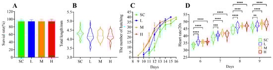 3.1. Effects of SMX on the Survival Rate, Total Length, Hatching Time, and Heart Rate of Marine Medaka Embryos