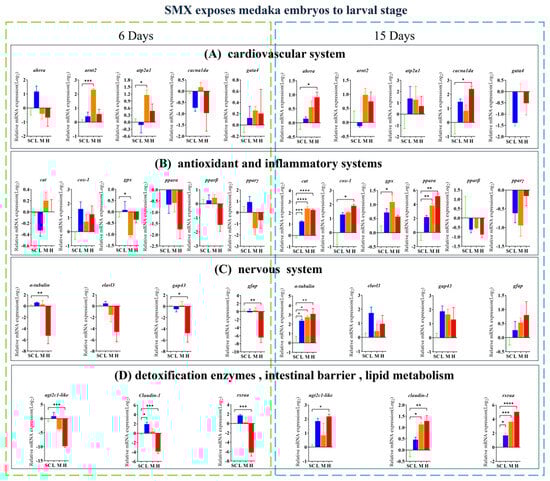 3.4. Effects of SMX on Gene Transcription in Marine Medaka Embryos and Larvae