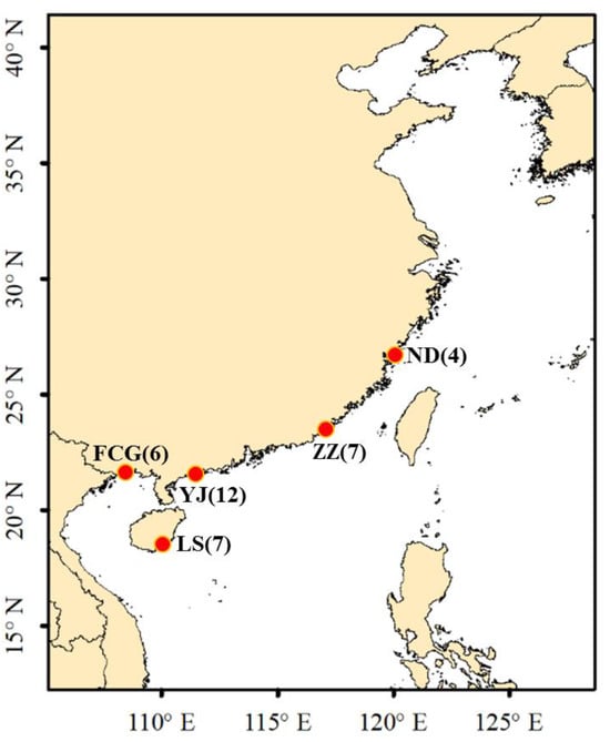 The 36 individual samples, which were called golden pompano, were collected from five aquaculture farms located in Ningde (ND), Zhangzhou (ZZ), Yangjiang (YJ), Lingshui (LS), and Fangchenggang (FCG), respectively, in the south of China in July 2022 (Figure 1). The sampling numbers at each site are as follows: ND: 4 (named as ND1–ND4), ZZ: 7 (named as ZZ1–ZZ7), YJ: 12 (named as YJ1–YJ12), LS: 7 (named as LS1–LS7), FCG: 6 (named as FCG1–FCG6). A piece of pectoral fin tissue was obtained from each individual and then preserved in 95% ethanol. All samples were stored at −20 °C and preserved at the National Marine Genetic Resource Center in Qingdao, China.
