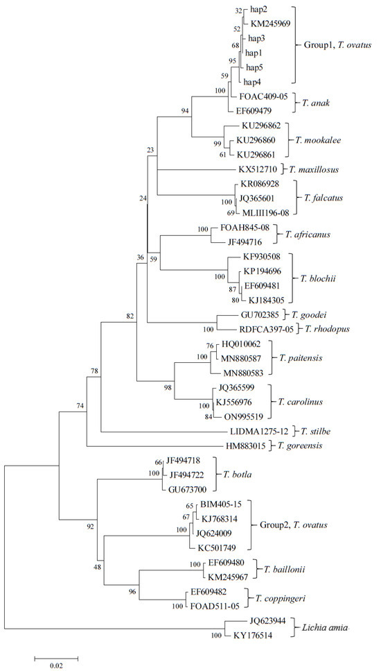All the reference sequences of T. ovatus were clustered into two different branches in the phylogenetic trees with large genetic distance respectively. One group (Group1) consisted of MK227447, KM245969, EU595325, JN242717, KF356397, KP112476, OP247575 and KY802069, which were known to come from Indo-west Pacific except KY802069 (Figure 2 and Figure 3, Table 1). All the golden pompano samples we collected from China were also be included in this group. Another group (Group2) included KC501749, JQ624009, BIM405-15 and KJ768314, which were all from East Atlantic (Figure 2 and Figure 3, Table 1). It could be inferred that the so-called Trachinotus ovatus represents two independent species that are distantly related. In the ABGD and bPTP analyses, the two groups were also delimited into two different species. Linnaeus (1758) [8] named Trachinotus ovatus as Gasterosteus ovatus for the first time in 1758 and documented its habitat is in Asia, while the habitat description is considered by Eschmeyer’s catalog of fishes to be a possible error record for the eastern Atlantic [38]. Kendall and Goldsborough (1911) [9] placed the species in the genus Trachinotus and documented that its type locality is in Tonga (Oceania). This appears to support the validity of the naming of Trachinotus ovatus from the Indo-west Pacific, and the so-called Trachinotus ovatus from the East Atlantic, which have 3–5 vertically elongated black spots on the anterior half of their lateral line, may represent a cryptic Trachinotus species, while its taxonomic status and whether it needs to be renamed requires further research. In Group1, between the golden pompano samples we collected and the reference sequences of T. ovatus, there are three shared haplotypes (hap1, hap2, and hap5) and the mean distance within group is only 0.1%, which is much smaller than the species-level divergence (2%) [39]. The above results support that the golden pompano in China can be provisionally identified as the species Trachinotus ovatus (Linnaeus, 1758).