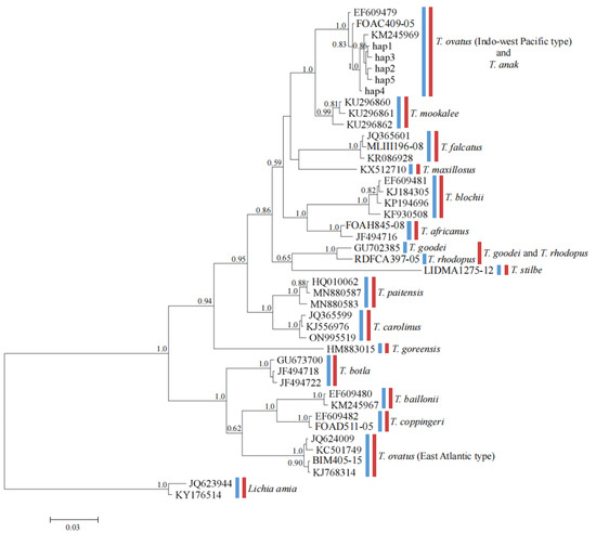 Bayesian tree that was constructed using the HKY+G+F model for COI gene sequences of 16 pompano species (genus Trachinotus). Numbers at nodes represent posterior probabilities (only values above 0.50 are shown). Scale bar represents substitutions per site. Lichia amia was chosen as the out-group to root the tree. The colored bars on the right side of the BI tree represent species delimitation (blue: based on bPTP method, red: based on ABGD method).