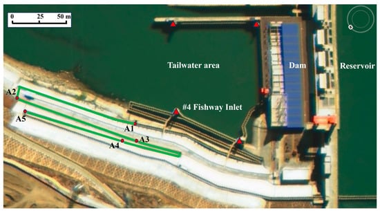 Aerial view of the test area. From right to left, the picture shows the reservoir, dam, and tailrace area. The fishway is arranged on the left bank of the river, and four fish inlets are arranged around the tailrace area (marked with a red triangle). The total length of the test section is about 655 m (marked with green lines), and there are five antennae (marked with red dots).