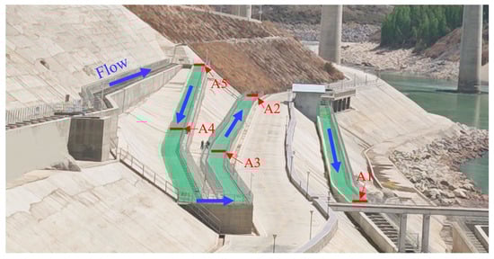 The experimental site layout diagram. The test section, covered with green artificial turf, includes a total of 285 pool chambers. The water flow direction within the fishway is indicated by blue arrows. Along the flow direction, five antennae—A5, A4, A3, A2, and A1—are sequentially positioned.