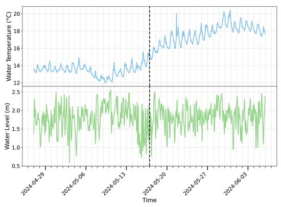 The water temperature and water level at antenna A1 were monitored from 27 April 2024 to 5 June 2024. The black dashed line indicates 17 May 2024, the date when the shading cloth was removed. The tick marks correspond to 00:00 each day. The lowest water temperature in the fishway occurs between 9:00 and 13:00, while the highest occurs between 16:00 and 20:00.