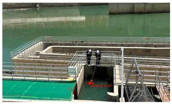 All the fish were captured using gill nets in the downstream river before the tagging procedure. They were implanted with PIT tags (8.3 mm × 1.4 mm; 0.02 g in air) using a needle injector through a small (0.4 cm) incision made along the ventral midline of the body cavity []. Before tagging, they were anesthetized with eugenol (0.02 g/L), then their bodyweight (W, g) and length (L, cm) were recorded. To reduce handling stress, all the procedures were carried out rapidly and completed within one minute. After surgery, the fish were transferred to a well-aerated tank with fresh river water for recovery. More than 12 h later, they were released into a resting pool downstream of the A1 antenna (Figure 4). The release times during the experiment were between 9:30–11:30 and 14:30–16:30, with a similar number of tagged fish released during each time window. A total of 76 fish were released during the experiment. In the DE, nine S. macropogon, nine S. waltoni, and eighteen S. oconnori were released. In the NE, 10 S. macropogon, 18 S. waltoni, and 12 S. oconnori were released. It is worth noting that multiple research teams have cumulatively placed over 800 tagged fish upstream and downstream of this fishway, and their passage through the antennae is recorded by us.