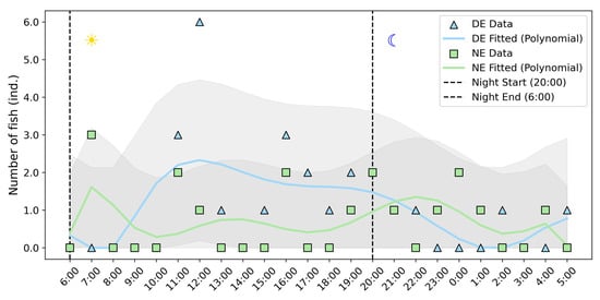 Diurnal rhythm (24 h) variations of the fish at the A3 antenna. The gray area represents the 95% confidence interval of the fitted curve.