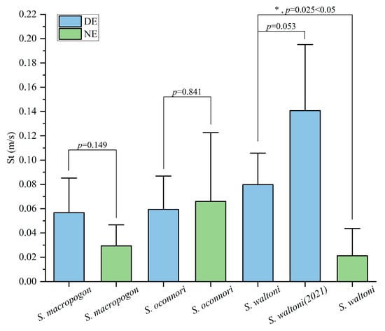 The average St of S. oconnori (0.066 m/s) was significantly higher than those of S. macropogon (0.029 m/s) and S. waltoni (0.021 m/s) (Table 2, Figure 6). In the DE, the average St of S. waltoni (0.080 m/s) was slightly higher than those of S. macropogon (0.057 m/s) and S. oconnori (0.059 m/s), with the latter two showing similar speeds. In the DE, the average St values of S. macropogon and S. waltoni were higher than those in the NE, increasing by factors of 2 and 3.8, respectively, while the average St of S. oconnori remained relatively stable across the two environments (Figure 6).