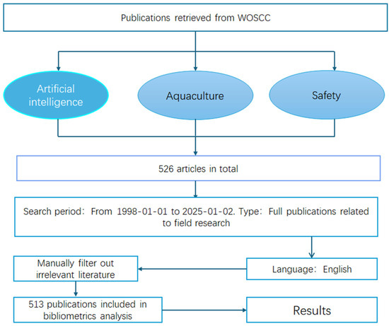 This study utilized the Web of Science Core Collection (WOSCC) database as the primary data source due to its high-quality features in the literature classification and comprehensive research coverage. Using a combination of keywords, the search covered publications from 1998 to 2025 related to artificial intelligence and aquaculture safety. A total of 513 relevant documents were identified, including 456 research articles and 57 review papers.