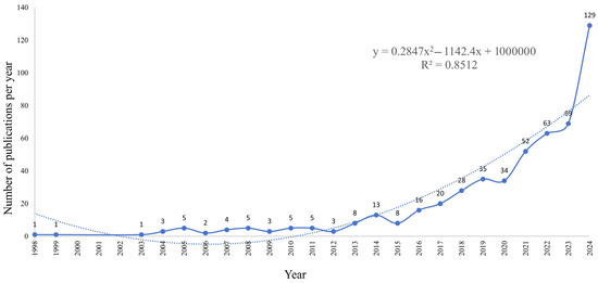 A regression analysis of data from 1994 to 2024 yielded a quadratic exponential growth model (y = 0.2847x2 − 1142.4x + 1000000), with a coefficient of determination (R2) of 0.8512, indicating a strong fit to the observed data. The analysis reveals that after a prolonged period of accumulation, the field has recently entered a phase of rapid development. This trend highlights the significant research potential and broad application prospects of artificial intelligence (AI) technologies in aquaculture safety. Driven by continuous technological advancements and deeper interdisciplinary research, research outcomes in this field are anticipated to continue their upward trajectory. These developments are expected to catalyze the intelligent and sustainable transformation of the aquaculture industry.
