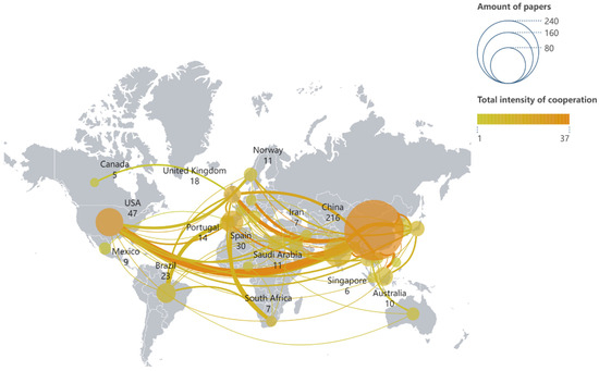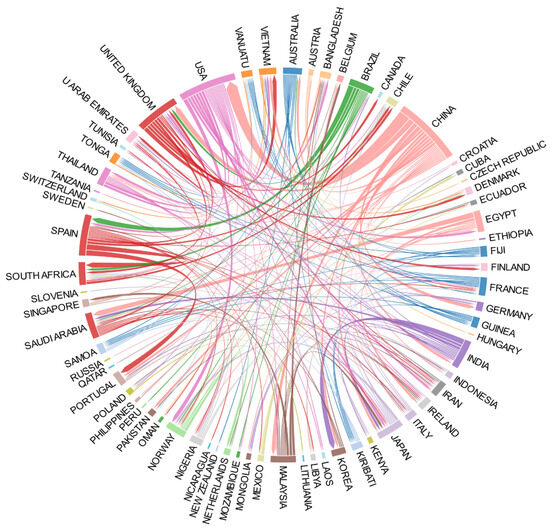 Based on the analysis of the national collaboration network map (Figure 3), the national collaboration chord diagram (Figure 4), and the summary in Table 3, China occupies a central position in this field, publishing the highest number of academic papers (216). Its collaboration network extends globally, demonstrating particularly strong ties with countries such as the United States, the United Kingdom, Australia, and Saudi Arabia. Additionally, other nations, including the United States (47 papers), Spain (30 papers), and Brazil (22 papers), also play significant roles in regional and international collaborations. The network map highlights China not only as a key node in bilateral partnerships but also as a pivotal player in promoting internationalization through extensive multilateral collaborations. The chord diagram further reveals the intricate interactions between countries. For example, it shows China’s strong connections with European countries, such as the United Kingdom and Spain, as well as the United States’ bridging role in facilitating collaborations between South American and Asian countries.