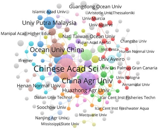 From the institutional collaboration network diagram (Figure 5), it is evident that the primary collaboration hubs in this field are centered around the Chinese Academy of Sciences (CAS) and China Agricultural University (CAU). Domestic partner institutions include Huazhong Agricultural University, Dalian Ocean University, and Guangdong Ocean University. In terms of international collaboration, key partners consist of University Putra Malaysia, National Taiwan Ocean University, the French Ifremer Institute, Macquarie University in Australia, and Mississippi State University in the United States. These collaborative networks span multiple prominent research institutions across Asia, Europe, and the Americas, forming a cross-regional, multi-centered collaboration network.