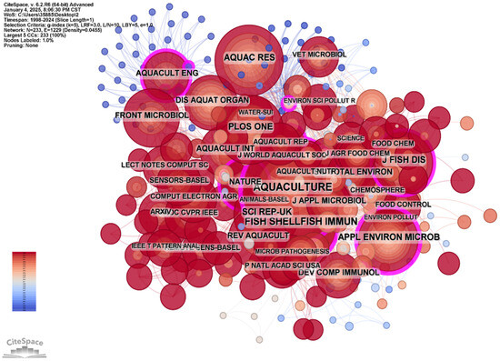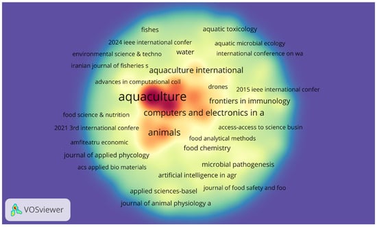 The journal co-citation network (Figure 6) and journal publication density map (Figure 7) reveal key research hotspots and primary dissemination channels for artificial intelligence in aquaculture safety. The findings indicate that core journals such as Aquaculture, Fish & Shellfish Immunology, and Applied and Environmental Microbiology play pivotal roles in this field, serving as critical nodes for knowledge dissemination and academic exchange. High-impact multidisciplinary journals, including Nature and Science, have significantly contributed to the interdisciplinary dissemination of related research, further enhancing the influence of AI technologies in aquaculture. Additionally, cross-disciplinary journals such as Sensors and Computers and Electronics in Agriculture highlight the expansion of AI research and applications into areas like sensor development and agricultural engineering.