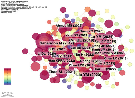 Co-cited network of authors’ literature. Cui BE (2019) [66], Li DL (2020) [67], Ahmed MS (2022) [68], Duan YQ (2020) [69], Liu YM (2020) [70], Saberioon M (2017) [71], Lu YM (2021) [72], Zhao SL (2021) [73], Fu YY (2021) [74], Cheng B (2020) [75], Adams A (2019) [76], Hou TT (2022) [77], Deng JP (2023) [78], Cui BE (2023) [79], Su H (2022) [80], Ren CY (2019) [81], Kang JM (2019) [82], Bochkovskiy A (2020) [83], Chen LC (2018) [84], Liu J (2023) [85], Haq KPRA (2022) [86], Yang XT (2021) [87].