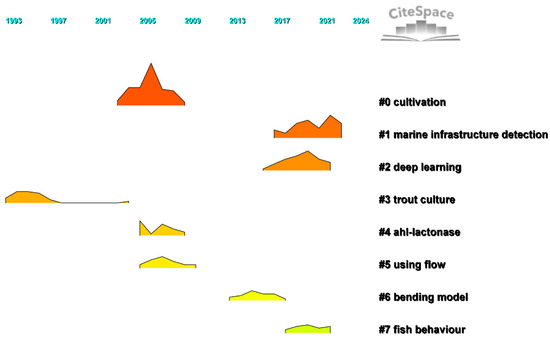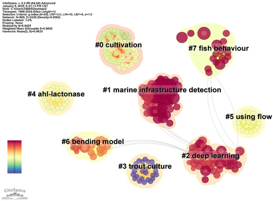 Figure 9 presents the co-citation clustering results of the literature on artificial intelligence in aquaculture safety, revealing the main research hotspots and development directions in this field. Cluster #0 “Aquaculture” is the core area, encompassing AI applications in optimizing the aquaculture environment, enhancing production efficiency, and monitoring water quality, thereby providing technical support for precise aquaculture management. Cluster #1 “Marine Infrastructure Inspection” focuses on real-time monitoring of aquaculture facilities using remote sensing and image recognition technologies to enhance system safety. Cluster #2 “Deep Learning” highlights the extensive application of AI core technologies in water quality prediction, disease detection, and fish behavior analysis, significantly improving management efficiency. Cluster #7 “Fish Behavior” emphasizes the use of intelligent monitoring technologies to analyze fish feeding and swimming behaviors, optimizing health management and feed delivery. Cluster #5 “Fluid Utilization” explores the dynamic relationship between water circulation and the aquaculture environment, ensuring water quality stability. Meanwhile, Cluster #4 “AHL Lactonase” examines the role of microbial communities in disease prevention and control, promoting the development of eco-friendly aquaculture technologies. Overall, these research directions indicate that artificial intelligence has become a key driving force in aquaculture safety, advancing the intelligent and sustainable management of the system.