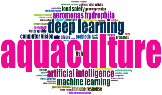 Figure 11 illustrates the high-frequency keywords and their relative significance in the field of artificial intelligence (AI) and aquaculture safety, highlighting the core research directions in this domain. Among these, “aquaculture” and “deep learning” are among the most prominent keywords, underscoring the pivotal role of AI technologies in advancing intelligent aquaculture management. High-frequency keywords such as “artificial intelligence”, “machine learning”, and “computer vision” indicate that research in this field broadly leverages advanced technologies to optimize farming efficiency and enhance management precision. Keywords like “food safety” and “water quality” highlight the emphasis on ensuring seafood quality and promoting environmental sustainability. Terms such as “immune response” and “Aeromonas hydrophila” further emphasize the importance of disease prevention and biosafety as critical research areas.