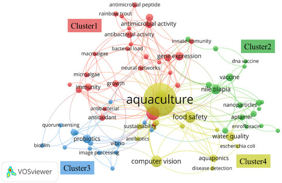 Figure 12 uses clustering analysis of high-frequency keywords to reveal research hotspots and trends in aquaculture. With the VOSviewer tool, keywords are grouped into four clusters. Cluster 1 (red) focuses on antimicrobial research, highlighting innovations in combining gene expression with neural networks for drug development. Cluster 2 (green) centers on vaccine development and biotechnology, showcasing efforts to use advanced technologies like nanotechnology to enhance disease prevention. Cluster 3 (blue) explores probiotics and microbial communities, emphasizing their role in promoting ecological health. Cluster 4 (yellow) underscores the importance of food safety and water quality monitoring, with artificial intelligence playing a key role in early disease detection.