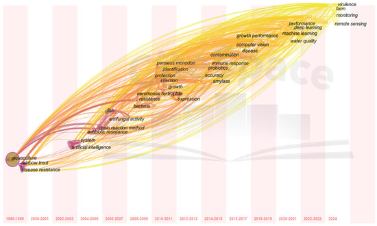 Figure 13 presents a timeline-based clustering of keywords related to the application of artificial intelligence in aquaculture safety, clearly delineating the evolution of research hotspots in this field. From 1998 to 2010, research primarily centered on “aquaculture” and “disease resistance”, with an emphasis on traditional farming techniques and disease prevention strategies. Between 2011 and 2017, attention shifted to “antibiotic resistance” and “bacteria”, reflecting increasing concerns about controlling pathogenic microorganisms in aquaculture environments and developing eco-friendly antimicrobial strategies. Since 2018, keywords such as “artificial intelligence”, “deep learning”, and “machine learning” have emerged as central themes, highlighting the widespread application of AI technologies in water quality monitoring, disease detection, and intelligent management. The appearance of terms like “remote sensing” and “immune response” underscores the critical role of intelligent technologies in optimizing the environment and enhancing biological control. Overall, the research focus has evolved from traditional techniques to intelligent management, underscoring the pivotal role of artificial intelligence in enhancing aquaculture efficiency and promoting sustainable development.