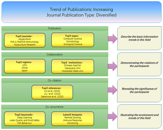 Figure 14 presents a knowledge map illustrating research trends and the knowledge framework of artificial intelligence in aquaculture safety. Publication trends indicate that research is primarily concentrated in three core journals: Aquaculture, Fish & Shellfish Immunology, and Aquaculture Research, spanning interdisciplinary fields such as computer science, microbiology, and ecological science. Collaboration networks reveal that China, the United States, and Spain are the major contributors, with key institutions including the Chinese Academy of Sciences, Macquarie University, and Mississippi State University, reflecting a robust model of international cooperation. Co-citation analysis highlights the pivotal role of highly cited studies, such as Cui et al. (2019) [66], Liu et al. (2018) [70], and Saberioon et al. (2020) [71], in areas like remote sensing, disease management, and aquaculture system optimization. Keyword co-occurrence analysis reveals high-frequency themes including “deep learning”, “water quality and food safety”, and “fish behavior”, while emerging hotspots such as “remote sensing”, “immune response”, and “monitoring” underscore the shift towards intelligent management. Overall, this field demonstrates increasing diversity and international collaboration. Artificial intelligence plays a critical role in water quality monitoring, disease control, and intelligent management, providing valuable insights for future research directions.