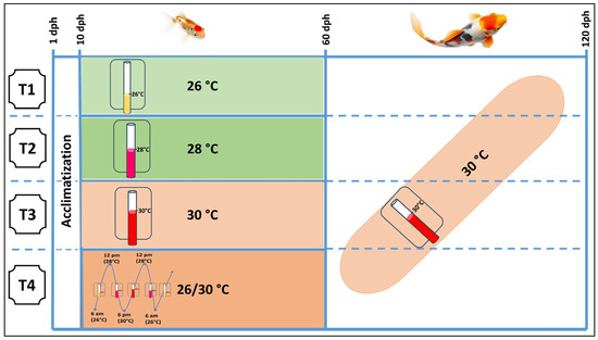 - Dasgupta, P.; Anandhi, D.U. Adaptation of Koi Carp (Cyprinus carpio) Exposed to Different Temperature Variants. Int. J. Innov. Sci. Res. Technol. (IJISRT) 2024, 9, 824–826. [Google Scholar] [CrossRef]