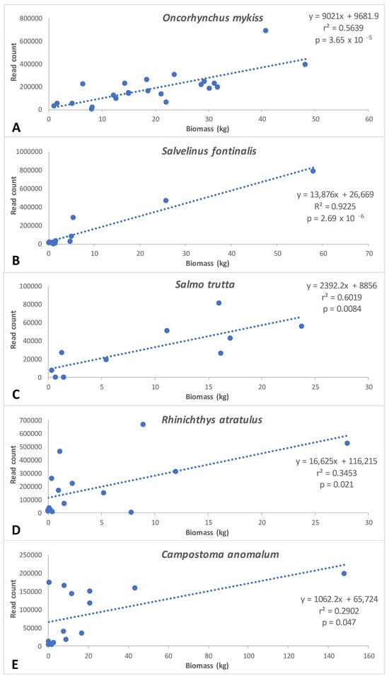 - McElroy, M.E.; Dressler, T.L.; Titcomb, G.C.; Wilson, E.A.; Deiner, K.; Dudley, T.L.; Eliason, E.J.; Evans, N.T.; Gaines, S.D.; Lafferty, K.D.; et al. Calibrating Environmental DNA Metabarcoding to Conventional Surveys for Measuring Fish Species Richness. Front. Ecol. Evol. 2020, 8, 276. [Google Scholar] [CrossRef]