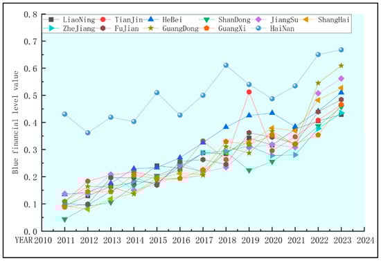 In Figure 1, blue finance shows a wavy upward trend, with a low overall level and obvious gaps between provinces. During the study period, the blue finance level of coastal provinces increases significantly, with an average increase of nearly four times, from 0.129 to 0.508, and an average annual growth rate of 3%. Blue finance grows the fastest in Shandong, with the blue finance index rising from 0.043 to 0.457, a nearly tenfold increase. The blue finance index in Hainan increases from 0.361 to 0.668, an increase of nearly 1.85 times, with an average annual growth rate of 6%. This shows that China has attached importance to blue finance in recent years, innovated investment and financing models, enhanced the role of blue finance in the marine field, and supported the sustainable development of the marine economy. However, in terms of the blue financial index of each province, the overall level is low. The average value of the blue financial index only reached 0.508 by the end of 2023. Regarding heterogeneity in blue finance development, it varies greatly between provinces. Among them, the blue finance level of Hainan is relatively high, with an average of 0.503; by the end of 2023, it had reached 0.667. Guangdong’s blue finance development level is second only to Hainan, reaching 0.609 by the end of 2023. Meanwhile, Liaoning, Guangxi, Zhejiang, and Shandong all have relatively low levels of blue finance. All were at around 0.45 by the end of 2023, significantly lower than the average for that year. Among them, Liaoning had the lowest blue finance level, with an average value of only 0.267—about half the average value of the blue finance index of Hainan.