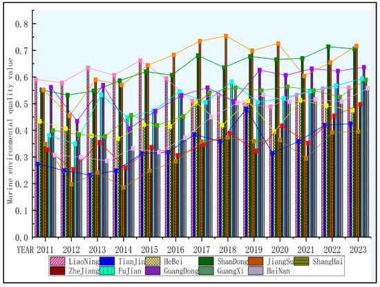 In Figure 2, the overall level of marine environmental quality shows a steep upward trend in China’s coastal provinces and cities, averaging about 0.559. However, interprovincial differences are still significant. During the study period, the marine environmental quality of all provinces and cities showed significant improvement. Among them, the marine environmental quality of Jiangsu remained at a high level, with an average value of 0.645. That of Shandong ranks second, with an average of 0.631. Hainan’s marine environmental quality showed the fastest growth, with an average annual growth rate of nearly 7%. At the end of 2023, marine environmental quality was 0.558. This shows that, since China implemented the construction of marine ecological civilization, marine environmental quality has greatly improved, the quality and stability of the marine ecosystem have been enhanced, and the carrying capacity and resilience of the marine environment have been strengthened. Nevertheless, there is an obvious, widening gap in marine environmental quality between regions. During the study period, marine environmental quality in Jiangsu rose from 0.551 to 0.716, with an average of 0.645, while that of Tianjin rose slowly from 0.274 to 0.425, with an average of 0.336. Shanghai’s marine environmental quality rose from 0.349 to 0.395, with an average of only 0.311. The average level of marine environmental quality in Tianjin, Shanghai, and other areas was clearly lower than that of the coastal regions and was only half that of Jiangsu, indicating polarization in marine environmental quality among provinces.
