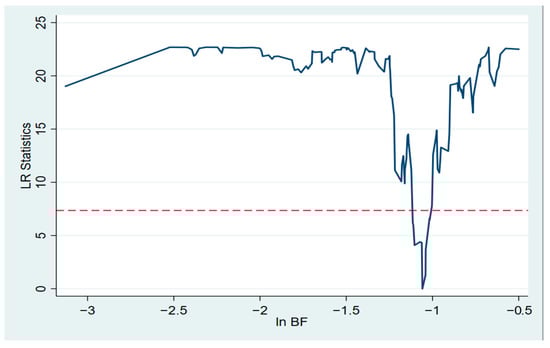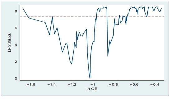 Taking the marine fishery economy as the explained variable, blue finance will serve as the core explanatory variable for the level of marine environmental quality, with blue finance as the threshold variable. A threshold model will be used to estimate whether there is a threshold value for blue finance, whether there is one threshold value, and whether there are two threshold values. Referring to Hansen’s (1999) bootstrap method, the p-value corresponding to the test statistic is obtained by repeated sampling 1000 times to determine whether there is a threshold effect. Table 5 shows the results. In the one-threshold model, the F-statistic is significant at the 1% level; that is, the p-value is less than 0.01. Therefore, there is a threshold value in the model. In Table 5, according to the principle of the threshold model, the threshold estimate is the corresponding value when the likelihood ratio (LR) statistic approaches 0. Figure 3 shows the threshold estimate of −1.0586 for blue finance and the LR function diagram under the 95% confidence interval. Similarly, taking the marine fishery economy as the dependent variable, blue finance as the core explanatory variable, and the level of marine environmental quality as the threshold variable, threshold models are used to estimate whether there is a threshold value for marine environmental quality, whether there is one threshold value, and whether there are two threshold values. Figure 4 shows the LR function diagram of the threshold estimate of −1.0285 for marine environmental quality. Among them, the lowest point of the LR statistic is the corresponding true threshold value; the dashed line indicates the critical value of 7.35. Since the critical value of 7.35 is obviously greater than the threshold value, the above threshold value can be considered true and effective.