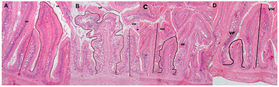 Histological sections of the anterior portion of the tambaqui intestine with 100x magnification under an optical microscope coupled to an image analyzer system to measure the height (VH) and perimeter (VP) of the villi, in HE staining after 84 experimental days. (A): CF/2x; (B): CF/3x; (C): R/2x; (D): R/3x.
