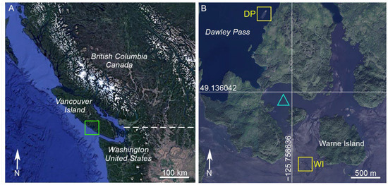 (A) Map showing western North America and Vancouver Island, British Columbia (BC), Canada, where the study took place. The dotted white line indicates the border between Canada and the United States of America and the green square shows the general area where the research was conducted. (B) Map showing Chinook salmon farm locations used for the project in Clayoquot Sound, BC. Farm sites are indicated by yellow squares (DP = Dawley Pass, WI = Warne Island). The sea cucumber collection site (and wild reference site) is shown by a blue triangle.