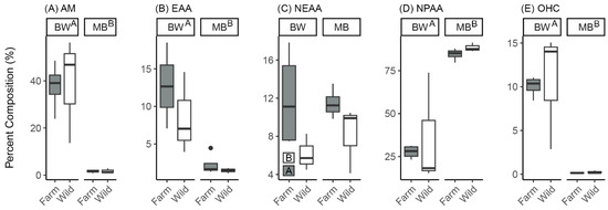 Relative composition (%) of five categories of nitrogenous metabolites in sea cucumber body walls (BW) and muscle bands (MB) after 3-month inclusion in Chinook salmon IMTA (dark gray boxes, Farm) and in wild sea cucumber reference samples collected > 1 km away from the farm sites (white boxes, Wild) in the same month (October). The categories of metabolites included (A) amines (AM), (B) essential amino acids (EAA), (C) non-essential amino acids (NEAA), (D) non-proteinogenic amino acids (NPAA), and (E) organoheterocyclics (OHC). Different upper-case letters indicate significant differences between treatments when there were significant main effects (sea cucumber treatment or tissue type) but no significant interaction. Bottom whiskers indicate the first quartile, while top whiskers indicate the fourth quartile. Boxes include the second and third quartiles separated by the median (thicker black line). The • symbol represents outliers outside the first and fourth quartiles.