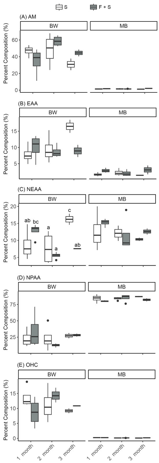 Relative composition (%) of five categories of nitrogenous metabolites in sea cucumber body walls (BW) and muscle bands (MB) after 1-, 2-, and 3-month inclusion in Chinook salmon IMTA. White boxes indicate sea cucumbers that were housed in cages with no fish (S), while gray boxes show sea cucumbers that were kept in cages with fish (F + S). The categories of metabolites included (A) amines (AM), (B) essential amino acids (EAA), (C) non-essential amino acids (NEAA), (D) non-proteinogenic amino acids (NPAA), and (E) organoheterocyclics (OHC). Different lower-case letters indicate significant differences between treatments when there was a significant interaction between the factors (fish proximity and IMTA duration). Bottom whiskers indicate the first quartile, while top whiskers indicate the fourth quartile. Boxes include the second and third quartiles separated by the median (thicker black line). The • symbol represents outliers outside the first and fourth quartiles.