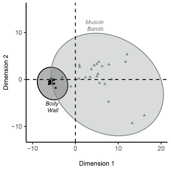 Unsupervised hierarchical clustering of principal components (HCPC) to explore the composition patterns of nitrogenous metabolites in sea cucumber tissues after 3-month inclusion in IMTA with Chinook salmon. Wild reference samples were also included in the analysis. Eighty-five unique metabolites belonging to five different classes were used for the HCPC (e.g., amines, essential amino acids, non-essential amino acids, non-proteinogenic amino acids, and organoheterocyclics). The most parsimonious clustering pattern revealed two clusters based solely on tissue type: (1) body walls (black circles) and (2) muscle bands (gray triangles). See Table 2 for details on the clusters. No other factors influenced the clusters, including length of inclusion in IMTA or wild reference versus IMTA samples. Ellipses indicate 95% confidence intervals based on the most parsimonious clustering pattern.