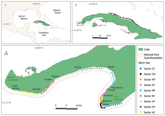 In 2015, the “Global FinPrint” https://globalfinprint.org (accessed on 15 November 2024) initiative was launched, bringing together a team of researchers and collaborators dedicated to the study of sharks and rays (elasmobranchs) to assess the conservation status of these species and determine the impacts to which they are subjected, using the BRUVs methodology []. Cuba joined this initiative in 2017. Three national parks in southern Cuba were included as study sites (GNP, Punta Francés, and Jardines de la Reina).
