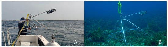 Ninety sites were sampled continuously in the park’s MPA during April 2017 (Figure 1) using the Baited Remote Underwater Video Surveys (BRUVs) methodology []. A BRUV platform was placed at each site, built with steel reinforcement bars arranged in a pyramidal shape for greater stability and with a height of 87 cm (Figure 2). A GoPro Hero 3 (IGoPro, Inc., San Mateo, CA, USA) camera was attached in an underwater housing to the structure, placed 40 cm above the level of the seafloor and with a sunscreen to reduce glare. A box with openings (dimensions: 20 × 14 × 16 cm) was placed on an arm that was 100 cm from the camera mount, containing 1000 g of standardized tuna, used as bait to attract sharks and other predators.