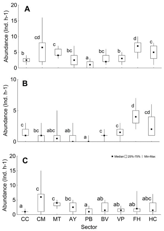 Significant differences were found between sectors regarding the variables of abundance and composition by species of the mesopredators (Table 3, Supplementary Material Table S4). The median for mesopredator abundance was 3 ind. h−1 (range 0–16), with more specimens being observed in the FH, CM, and HC sectors (Figure 3A). The median for shark abundance was 1 ind. h−1 (range 0–7), with the highest number being observed in the FH and HC sectors (Figure 3B). The median for big fish abundance was 2 ind. h−1 (range 0–15), with the CM sector presenting the highest abundance (Figure 3C).