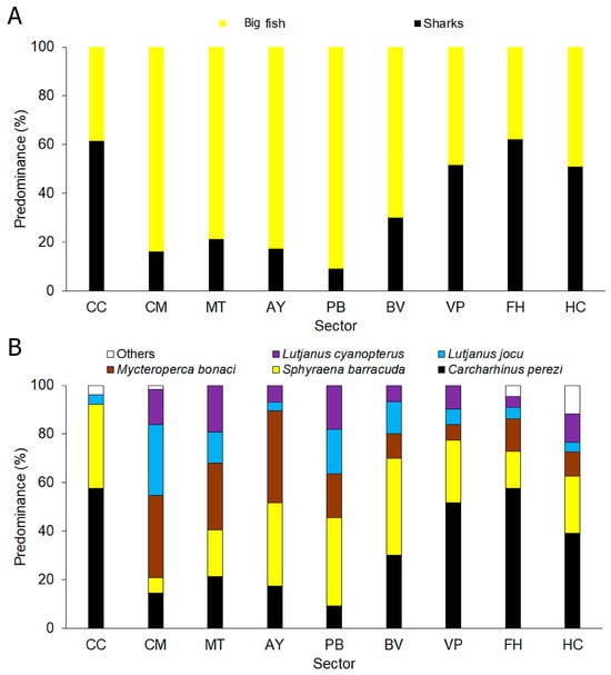 Mesopredator species composition per sector. (A) Sharks and big fish predominance. (B) Predominance of the most abundant species. CC: Cabo Corrientes; CM: Corona-Mobby Dick; MT: Mobby Dick-Tetas de María; AY: Almirante-Yemaya; PB: Piedra Blanca-Bajada; BV: Bajada-Verraco; VP: Verraco-Perjuicio; FH: Farallón-Holandés; HC: Holandés-Caleta del Piojo.