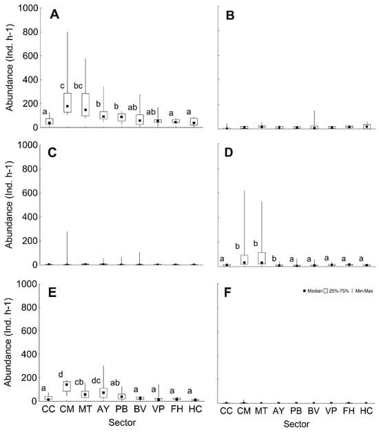 The median for prey abundance was 74 ind. h−1 (range 10–801), with more specimens being observed in the CM and MT sectors (Figure 5A). The median abundance of herbivores was 11 ind. h−1 (range 0–148) and the median number of fish that eat invertebrates was 1.5 ind. h−1 (range 0–278), without significant differences among sectors in both cases (Figure 5B,C). Piscivores had a median abundance of 13 ind. h−1 (range 1–617), with the largest abundance in the CM and MT sectors (Figure 5D). The piscivores/invertivores group had more individuals in the CM sector (Figure 5E), with a general median of 29 ind. h−1 (Range 3–301). Planktivores were the least abundant and did not display significant differences among sectors (Figure 5F), with median of 0 ind. h−1 (range 0–29).