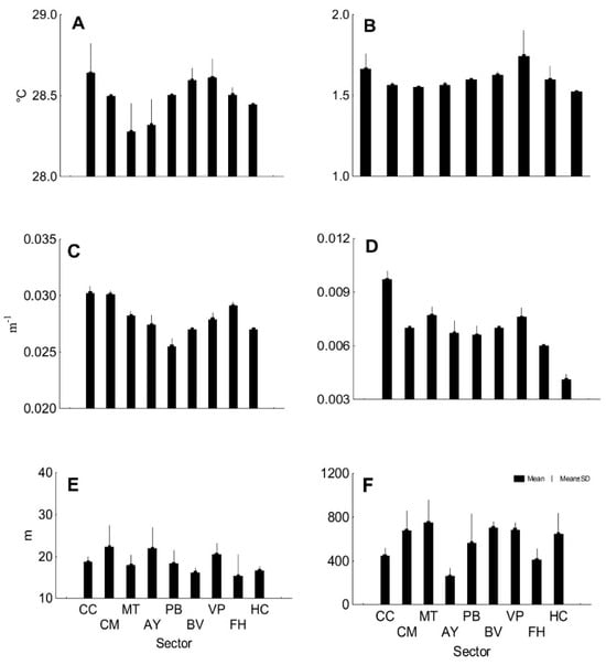 The mean of AVE SST was 28.5 °C (SD 0.16), and the mean of SD SST was 1.6 °C (SD 0.09), with little variability among sectors in both cases (Figure 6A,B). The means of AVE KD490 and SD KD490 were variable among sectors (Figure 6C,D), with values of 0.03 m−1 (SD 0.001) and 0.007 m−1 (SD 0.001). The working depth varied between 12 and 30 m (Figure 6E), and the sites distanced from the shore between 165 and 1058 m (Figure 6F).