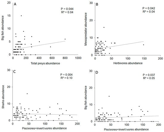 Relationship between biological univariate variables, predictive (X-axis) and response (Y-axes), that showed significant relationships between them according to DISTLM analyses. P: significance value; R2: determination coefficient. (A) Relationship between the abundance of large fish and total prey; (B) Relationship between the abundance of mesodepredador and herbivores; (C) Relationship between the abundance of sharks and piscivores + invertivores; (D) Relationship between the abundance of big fish and piscivores + invertivores.