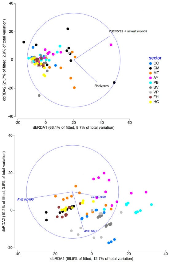 Relationship between univariate variables (mesopredator variables and abiotic variables), predictive (X-axis) and response (Y-axes), that showed significant relationships between them according to DISTLM analyses. P: significance value; R2: determination coefficient. (A) Relationship between mesopredators abundance and SD KD490; (B) Relationship between mesopredators abundance and AVE KD490; (C) Relationship between mesopredators abundance and shore distance; (D) Relationship between sharks abundance and SD KD490; (E) Relationship between sharks abundance and AVE KD490; (F) Relationship between big fish; abundance and SD KD490; (G) Relationship between big fish abundance and shore distance. In general, the relationship between the variability of biological/abiotic variables and mesopredator species composition was not clear according to dbRDA analysis (Figure 9). The analysis separated some sites from the AY sector and one site from the CM sector, where piscivores/invertivores predominated, as well as a site from the CM sector, where piscivores were more abundant.