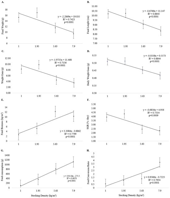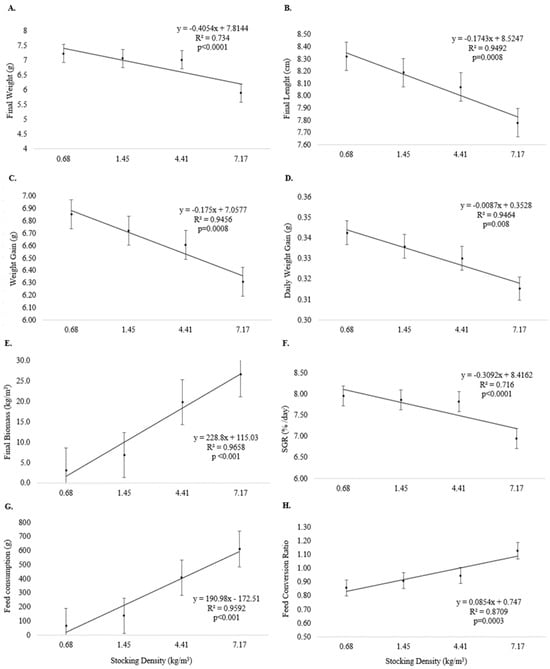 Growth performance (means and standard error) of pirapitinga (Piaractus brachypomus) after 20 days of culture in Phase 2 at different stocking densities in RAS. (A) Final weight, (B) final length, (C) weight gain, (D) daily weight gain, (E) final biomass, (F) specific growth rate, (G) feed consumption, and (H) feed conversion.