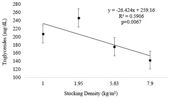 At the end of Experiment II, plasma triglycerides were inversely related to increasing density (Figure 4 and Table 2) (p < 0.05). There were no differences in the regression analyses for tHb and MCV; however, higher values were observed for the lowest density (D1.0) (p < 0.05) (Table 1). The other variables analyzed, as well as VSI and HSI, did not differ significantly among treatments (Table 2).