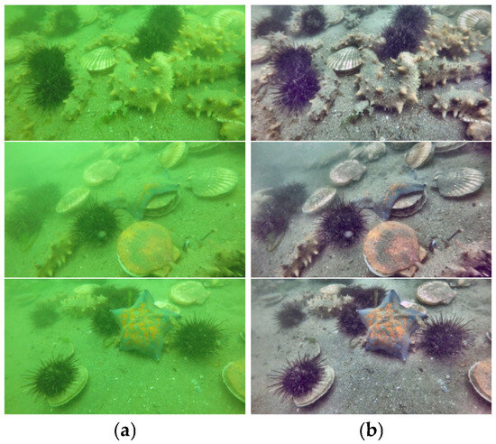 Enhancement images are presented in Figure 2b, while Figure 2a consists of the original images. The enhanced image resolves issues related to color deviation and low contrast, providing a visually enhanced effect and rich detail information. This is beneficial for training the target detection model.