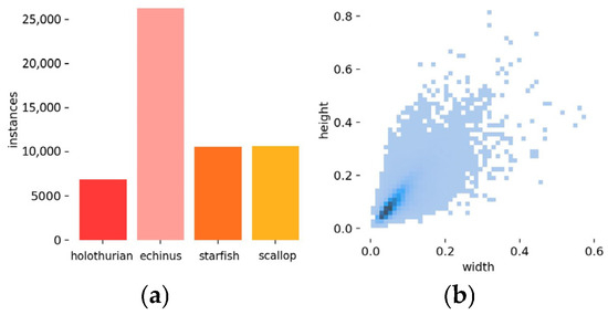 The results of the EUBID dataset underwent statistical analysis as shown in Figure 3. From Figure 3a, it is apparent that there is a category imbalance issue in the dataset, in which the quantity of echinus-labeled instances is remarkably greater than the other three categories. Object detection often encounters the issue of category imbalance, particularly when certain categories contain significantly more data than others. This disparity can result in a suboptimal detection performance for minority classes. So, utilizing a suitable loss function can reduce the overwhelming influence of the majority class on the loss, thereby enhancing the learning capacity of the minority class. In addition, it is obvious that there are more instances of small targets in the dataset from Figure 3b, which also increases the difficulty of detecting the targets for the model.
