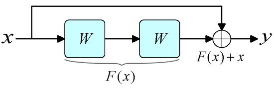 And the formula is shown in (4), where x represents the input; y represents the output; F(⋅) denotes the residual function; θ(⋅) represents the activation function; and W represents the weights.