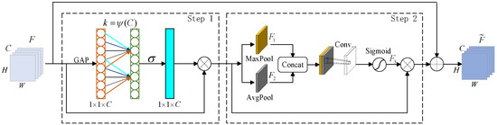From the figure, Step 2 makes it easier to locate and weight areas of interest on the feature map more precisely, enhancing the accuracy by extracting more discriminative features. Maximum and average pooling are applied to F to gain the F1 and F2 features, respectively. F1 and F2 are subsequently combined and exposed to a convolution operation. The spatial attention weights F3 are obtained by normalizing the features acquired from convolution operations using the sigmoid function. Relevant expressions are shown in Formulas (7)–(10), where Conv(⋅) represents a 2D convolution operation, [,] denotes a Concat operation, and ⊗ signifies element-by-element multiplication.
