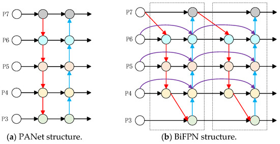 The YOLOv10 model generates fused output features by performing upsampling and splicing operations on different features. However, it overlooks the unequal contribution of features at each level to the fused output features. A straightforward and effective bidirectional feature pyramid network (BiFPN) [29], illustrated in Figure 6b, is introduced into the YOLOv10 model to address this issue. And the PANet structure is illustrated in Figure 6a. The BiFPN network applies a bottom-up and top-down bi-directional cross-scale connectivity for improving the quality of multi-scale feature fusion. And it uses horizontal skip connections to connect the original output nodes and input nodes of the same feature. This allows features to be directly transmitted between different levels, preserving semantic information of deep and shallow features more effectively and integrating feature information from different levels without increasing costs.